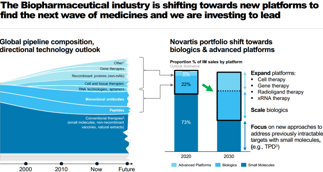 预计到2030年,通过领先技术平台如细胞疗法、基因疗法等开发的产品以及生物药的全球市场份额将大幅增加,诺华也积极布局新兴技术平台,公司目前已拥有领先的5大技术平台,包括靶向蛋白质降解技术、细胞疗法、基因疗法、放射性配体疗法以及RNA疗法。