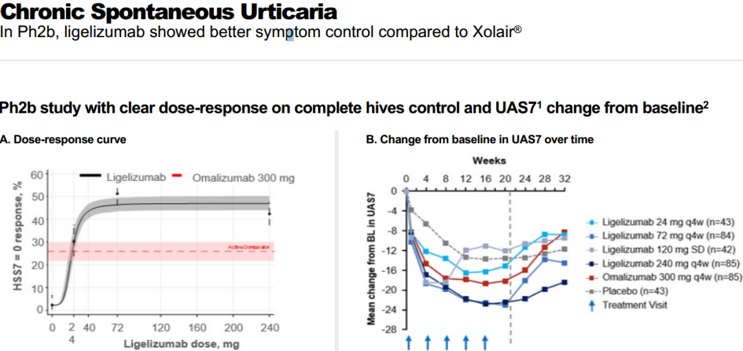 一项针对中重度慢性自发性荨麻疹(CSU)患者开展的IIb期剂量探索性研究中,与Xolair相比,ligelizumab组荨麻疹得到完全缓解人数更多(51% vs. 26%)。ligelizumab曾获FDA突破性疗法认定,目前正在开展针对CSU的III期研究。