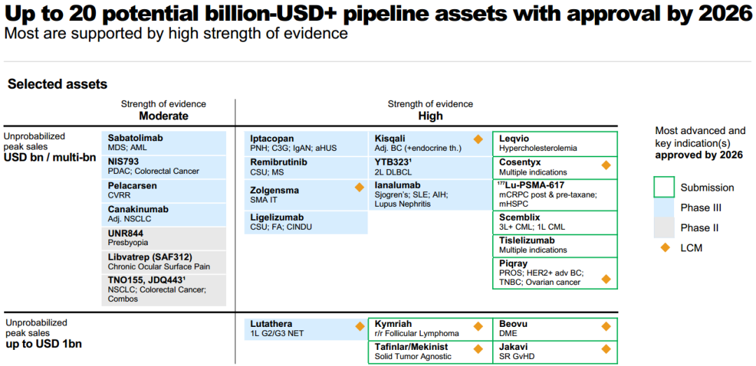 诺华主要布局的疾病领域包括心血管-肾脏领域,免疫学,神经科学,肿瘤学,血液学。市场上在售的重磅产品达14款,2026年将有20款10亿美元以上的重磅项目获批。