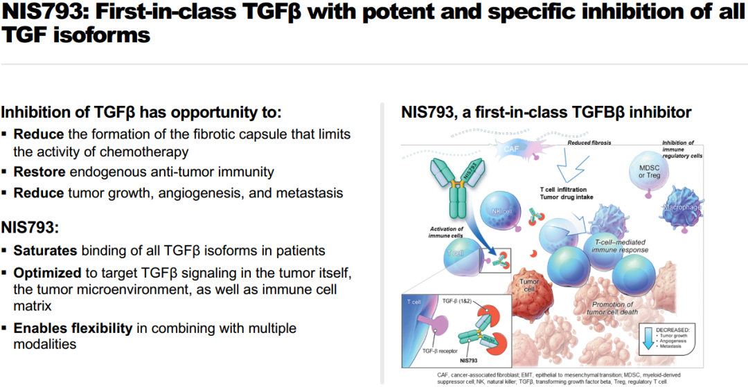 每年,全球约有50万患者被确诊为胰腺导管腺癌(PDAC),190万患者被确诊为结直肠癌(CRC)。TGF β是PDAC等类型肿瘤纤维化包膜形成和维持的关键因素,这种纤维化被认为会限制标准护理化疗的疗效。NIS793是一种潜在的first-in-class靶向TGFβ的中和抗体。