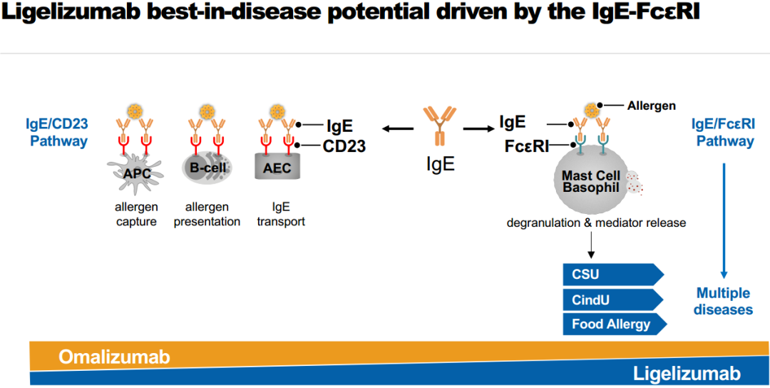 Ligelizumab是诺华开发的下一代抗IgE单抗,通过阻断IgE/FcεRI通路发挥作用,IgE/FcεRI通路是过敏性疾病炎症过程的关键驱动因子。与Xolair(奥马珠单抗)相比,Ligelizumab具有更高的选择性和不同的结合位点,有望成为新的治疗标准。