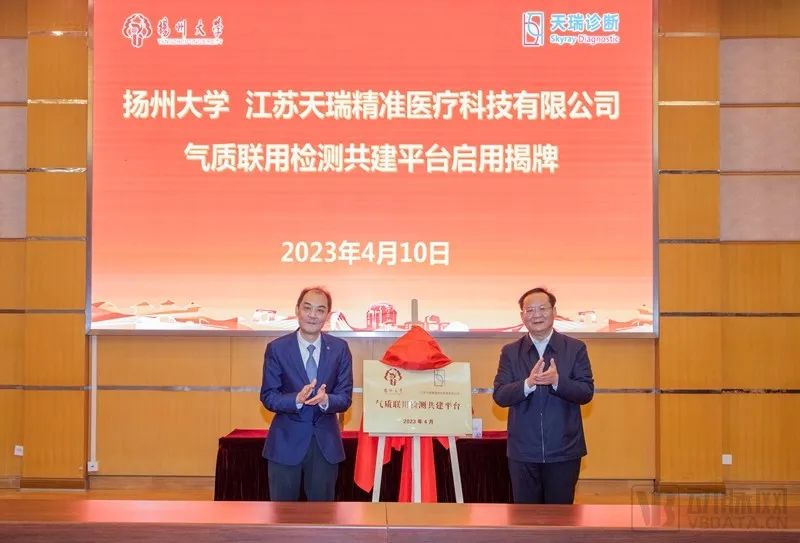 扬州大学校长丁建宁与江苏天瑞精准医疗科技有限公司董事长杨毅共同为气质联用检测共建平台揭牌