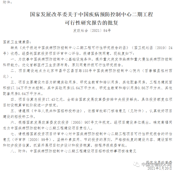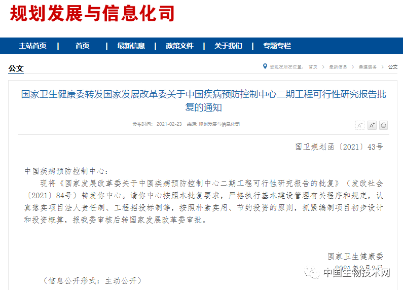 2月23日,国家卫健委转发国家发改委《关于中国疾病预防控制中心二期工程可行性研究报告批复的通知》。