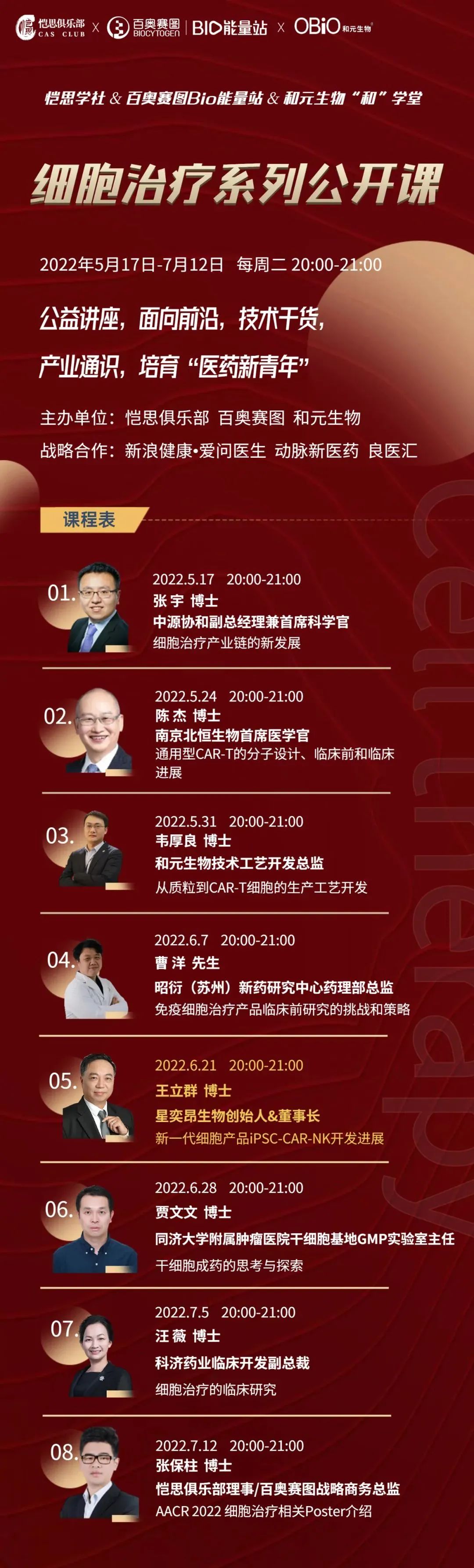 5月17日至7月12日,每周二20:00-21:00,8期连场,恺思俱乐部携手百奥赛图、和元生物,共同邀请8位产业资深专家,以线上公开课的形式,系统性的向大家分享细胞治疗的前沿进展,以期让更多的人认识及了解细胞治疗,激发学习兴趣,促进行业发展!