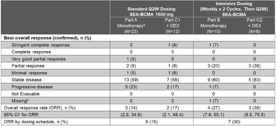 对于强化的SEA-BCMA给药方案和联合DEX(C2)组合,SEA-BCMA剂量水平(80mg和1600mg)的ORR为38%,mDOR尚未达到。两个强化给药组(B+C2)和两个标准给药组(A(1600mg)+C1)的综合ORR分别为30%和15%。