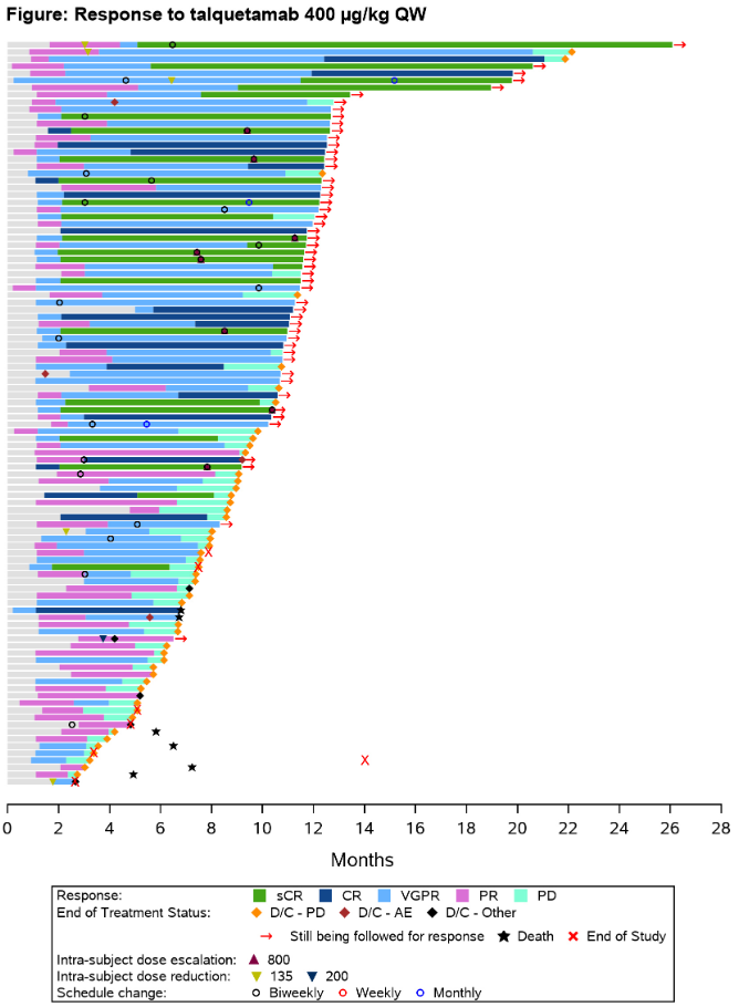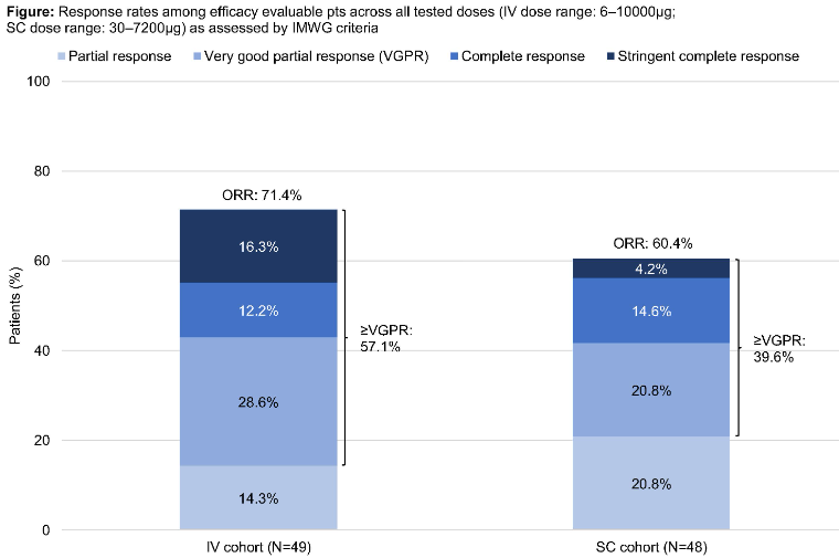 在接受过抗BCMA治疗的10/18名患者(55.6%)和有高危细胞遗传学的18/28名患者(64.2%)中观察到缓解。DoR数据在数据截止时不成熟。IV组24/35名患者持续缓解(68.6%),SC组26/29名患者持续缓解(89.7%),最大DoR分别为12.9个月和8.8个月。