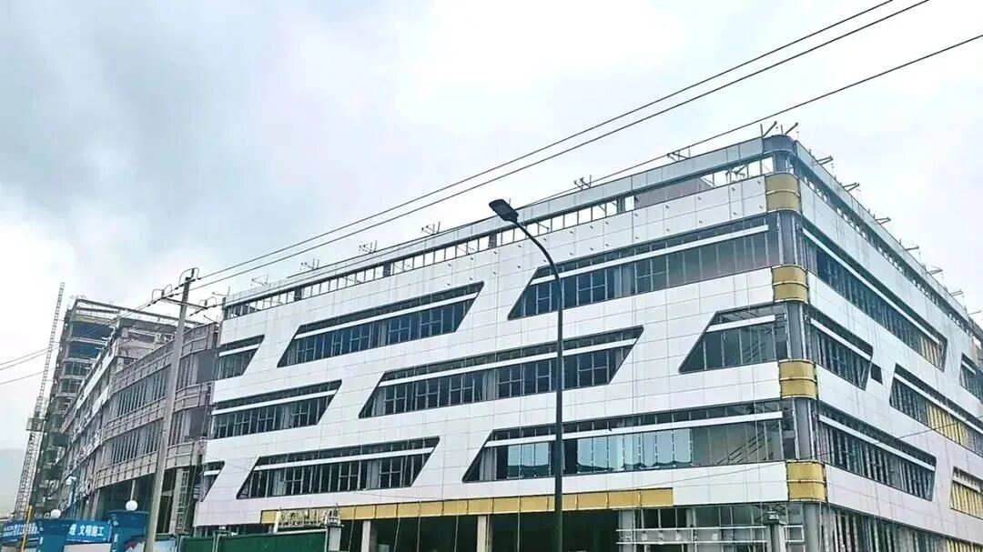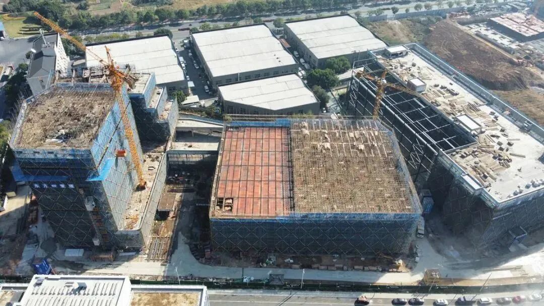 在施工现场,研发楼、宿舍楼、生产厂房等建筑的外立面围挡已拆除,幕墙窗框安装、钢连廊柱焊接、室内管道安装等有条不紊地推进……