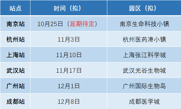 11月-12月,我们将相继走进“南京生命科技小镇”、“杭州医药港小镇”、“上海张江科学城”、“武汉光谷生物城”、“广州国际生物岛”、“成都医学城”,”敬请期待!