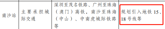 而南沙街坊比较关注的地铁15号线也有消息了,文件中把南沙站定位为主要承担地铁城际交通,将会有深圳至茂名铁路、广州至珠海(澳门)高铁,南沙至珠海(中山)、中南虎城际铁路等,并规划引入地铁15、18号线。
