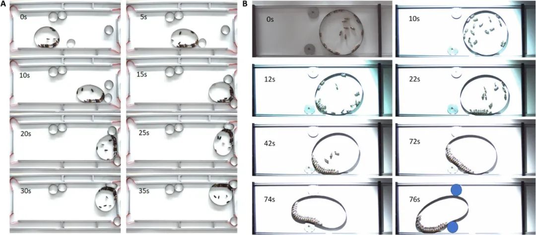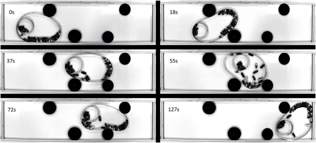 为了探索其运动性能,研究人员对这种超结构机器人在对复杂几何形状空间的探索进行了研究,分别完成负载、越障、清障等任务。在实验中,为了追踪这些单体机器人的运动轨迹和获取相关运动数据,研究人员把单体机器人涂成了黑色,便于观察。