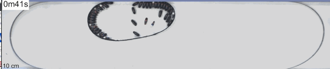 可以发现单体机器人的清障能力有限,而装载了 20 个单体机器人超结构机器人在不到 40 秒的时间里把空圆柱推出场地,实现高效率的路面清障: