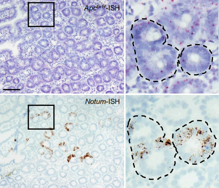 研究人员破译了Apc突变细胞如何获得优于野生型的克隆优势来实现固定。研究人员发现,Apc突变细胞富含编码几种分泌性WNT拮抗剂的转录物,其中Notum表达最高。来自Apc突变细胞的条件培养基以NOTUM依赖性方式抑制野生型类器官的生长。
