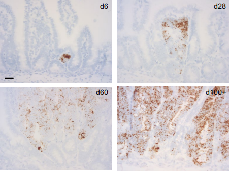 研究人员介绍,抑癌基因APC是结直肠癌中最常见的突变基因。肠道干细胞中Apc的缺失通过增加WNT信号传导来驱使小鼠腺瘤的形成,但WNT配体分泌的减少增加了Apc突变肠道干细胞定殖隐窝(也称为固定)的能力。