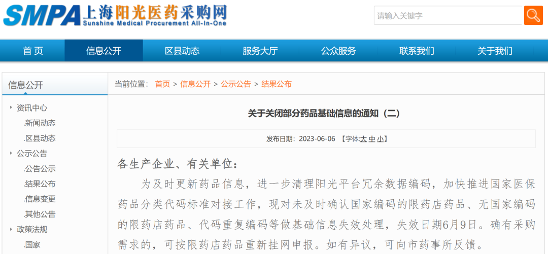 6. 上海阳光医药采购网:关于关闭部分药品基础信息的通知(二)