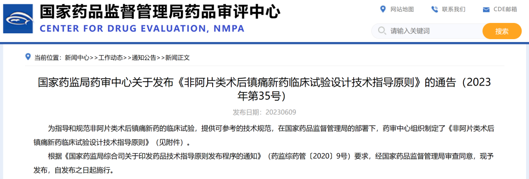 3. 国家药监局药审中心关于发布《非阿片类术后镇痛新药临床试验设计技术指导原则》的通告(2023年第35号)