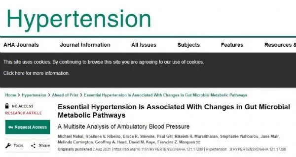 Michael Nakai,Rosilene V. Ribeiro,Bruce R. Stevens,et al. Essential Hypertension Is Associated With Changes in Gut Microbial Metabolic Pathways, Hypertension (2021). DOI:10.1161/HYPERTENSIONAHA.121.17288