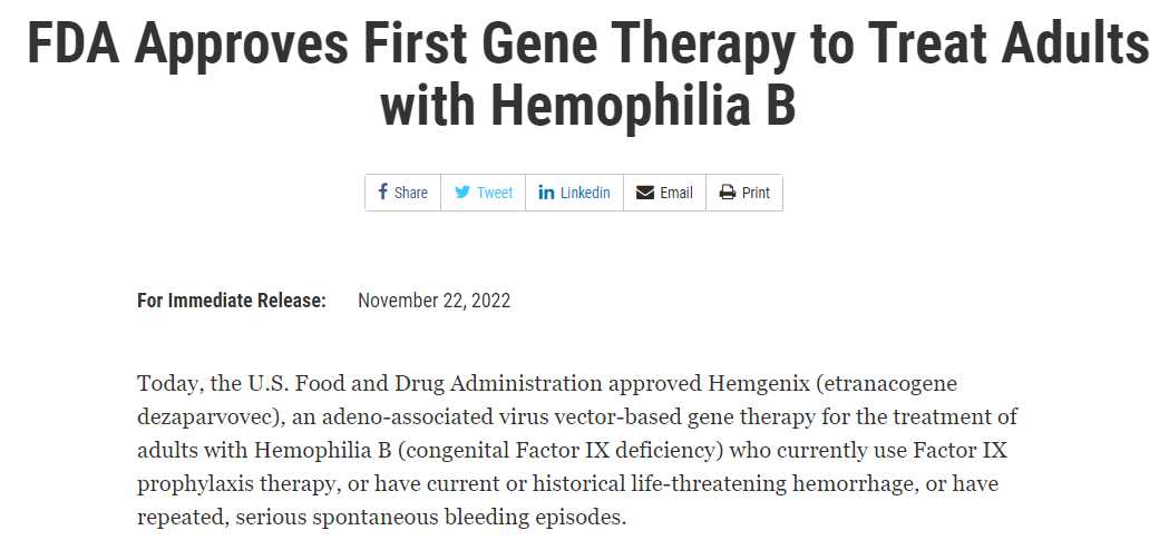 11月22日,FDA宣布,uniQure与CSL Behring的B型血友病基因疗法etranacogene dezaparvovec(AMT-061,CSL222)获FDA批准上市,用于治疗B型血友病成人患者。这是首款被批准用于B型血友病的基因疗法。