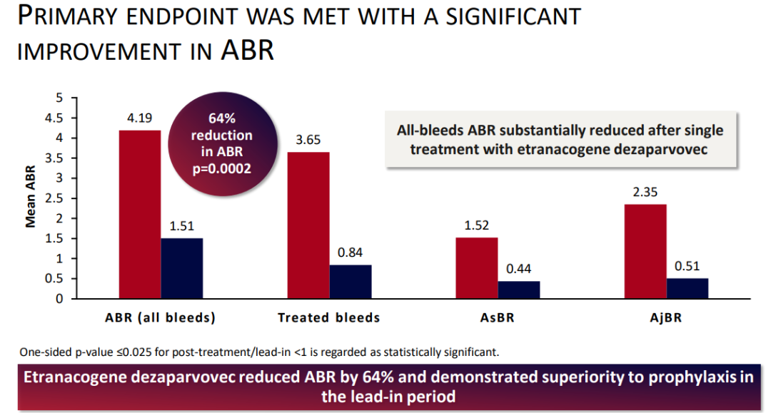 HOPE-B研究主要终点为与接受6个月预防疗法相比,接受etranacogene dezaparvovec治疗的患者在维持稳定FIX活性水平后的第52周的年出血率(ABR)。次要终点包括患者FIX的活性及给药后患者ABR的统计学差异。