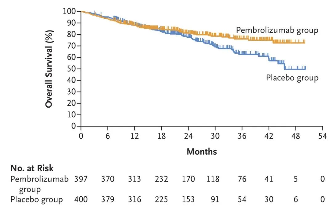 试验将继续进行,以便进行总生存期(OS)的额外随访,这是另一个主要终点。在这次中期分析时,Keytruda治疗方案与术前化疗相比,观察到OS有利的趋势(HR=0.73,[95% CI,0.54-0.99],p=0.02124),不过OS数据尚未成熟,未达到统计学意义。这些结果在今天的2023美国临床肿瘤学会(ASCO)年会上展示,同时也在《新英格兰医学杂志》上发表。