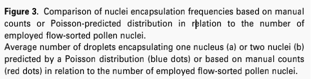Crystal™数字PCR系统具有极高的分辨率,因此在那些成功扩增标记物的微滴中,也可以观察到微滴内的细胞核(图2c),研究者通过对微滴包裹核的数量分析进一步优化实验,通过用热稳定的限制性酶预处理花粉核来提高基因分型的效率,且因为细胞核数量与单个包裹细胞核的微滴数量呈正相关,提出上样细胞核的最佳数量范围(因不同物种细胞核大小不同而有所不同)。