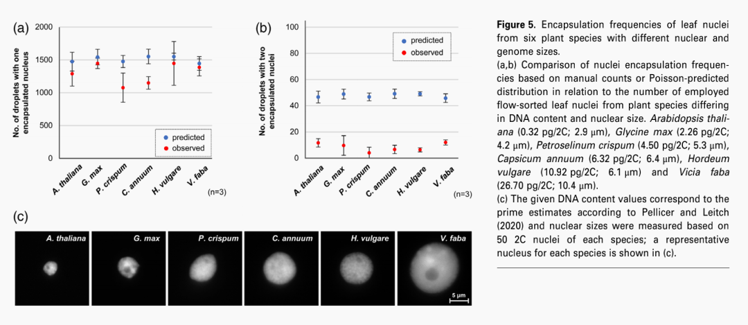 图4:不同核和基因组大小的六种植物叶片核的微滴包裹效率