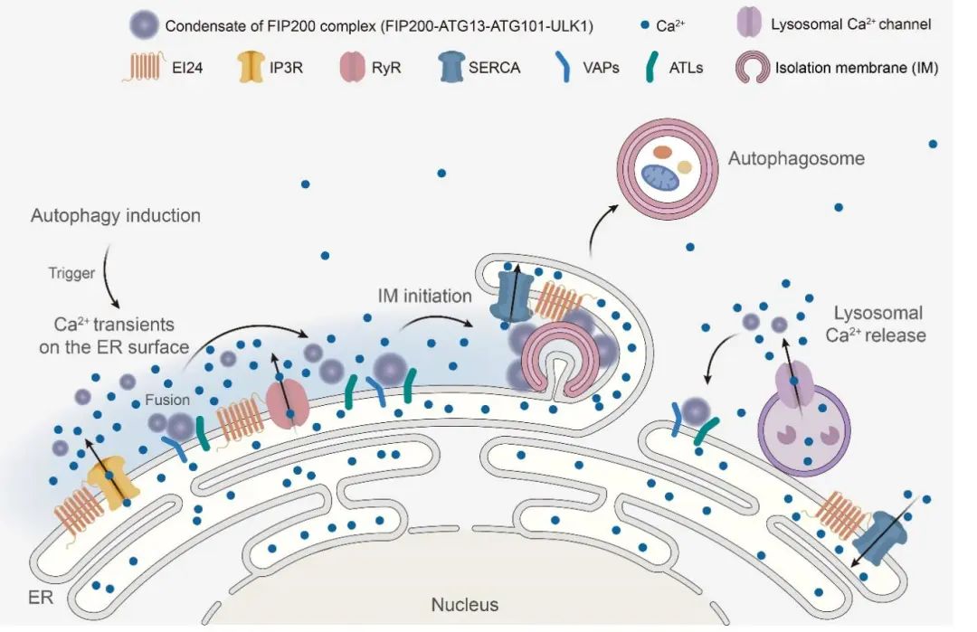 Figure 3. 内质网外膜钙瞬变触发FIP200复合物发生液-液相分离,并定位于内质网形成自噬起始位点的模式图。