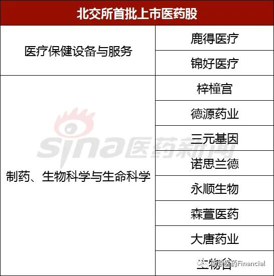 北交所首批上市公司涵盖25个国民经济大类行业,其中,涉及医药领域的有10家,具体可分为医疗保健设备与服务行业和制药、生物科学与生物科学两大类,包括生物制药企业2家、中药企业3家、特色原料药企业1家、化药企业1家、医疗器械企业2家以及兽药企业1家。