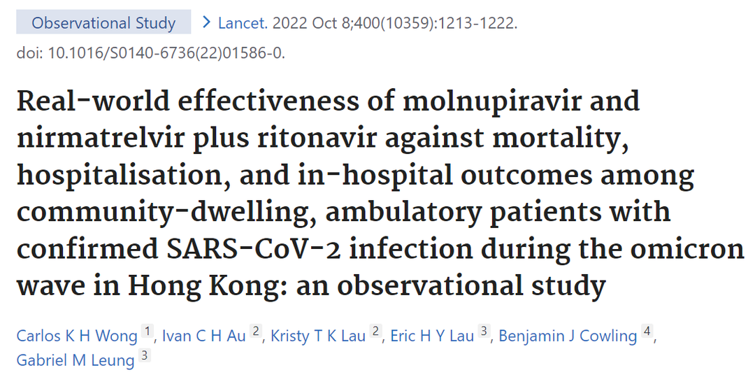 2022年10月8日,香港大学公共卫生学院高本恩教授团队在《柳叶刀》杂志发布了一项关于新冠口服药物莫努匹韦(Molnupiravir)和奈玛特韦/利托那韦(Paxlovid)治疗奥密克戎感染患者的真实世界研究,评估了两种口服抗病毒药物在香港新冠肺炎门诊患者中的临床疗效。