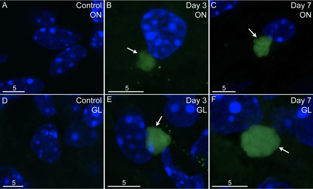 结果显示,在感染肺炎衣原体后的第3天和第7天,研究者从全部的四个组织中均分离出了肺炎衣原体;而对照组中并未检测到。比如,在嗅球中,接种后3天的IFU数量明显高于接种后的7天,而三叉神经正好相反。