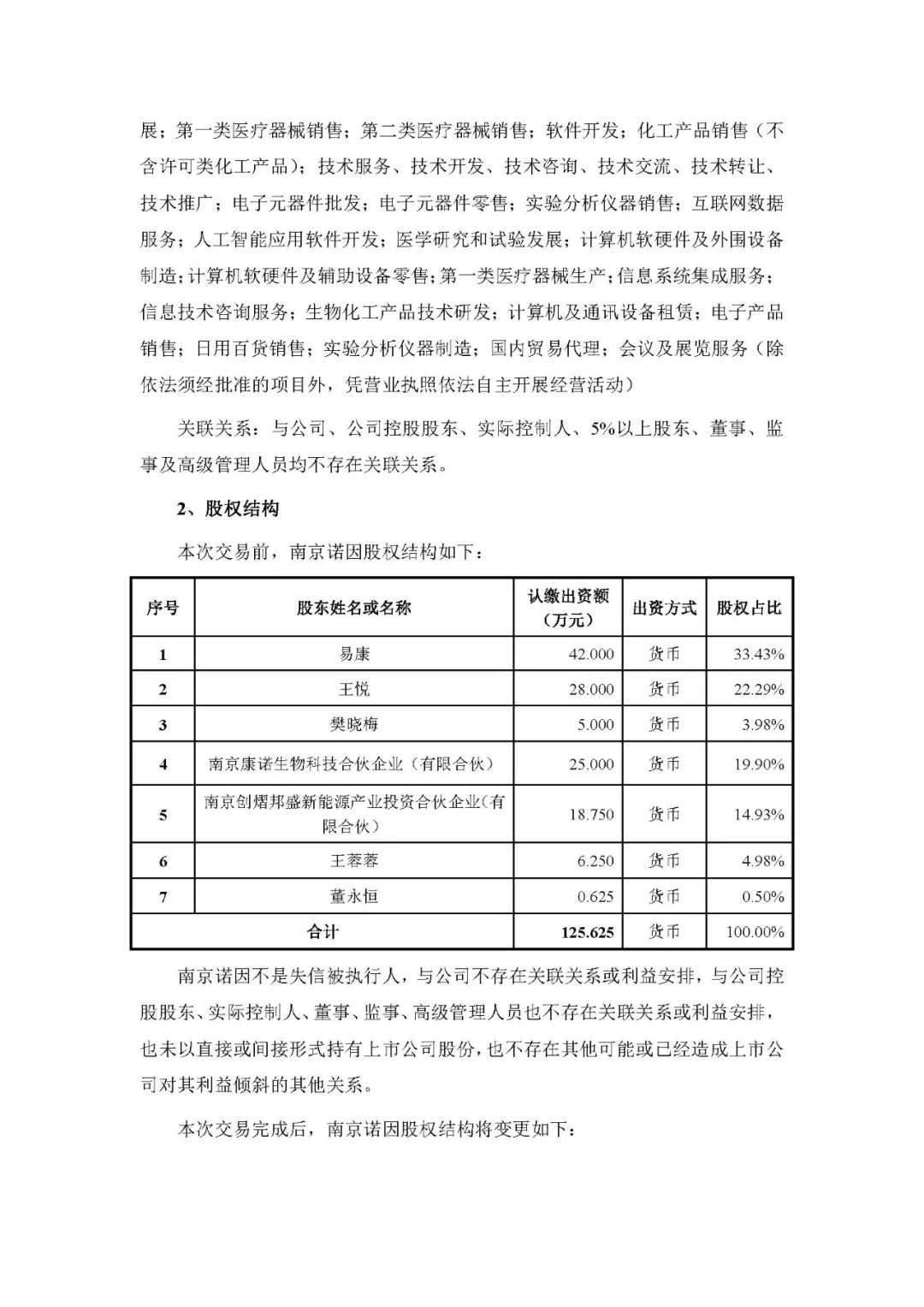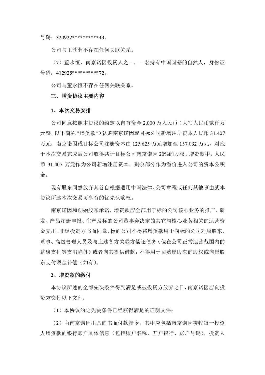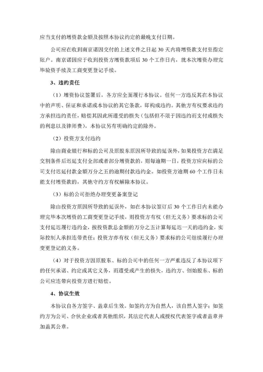 明德生物公布,公司与南京诺因于2021年11月22日在江苏省南京市签署了《关于南京诺因生物科技有限公司之增资协议》,约定以自有资金方式增资2000万元认购南京诺因新增注册资本人民币31.407万元,本次交易后,公司将持有南京诺因20%的股权。