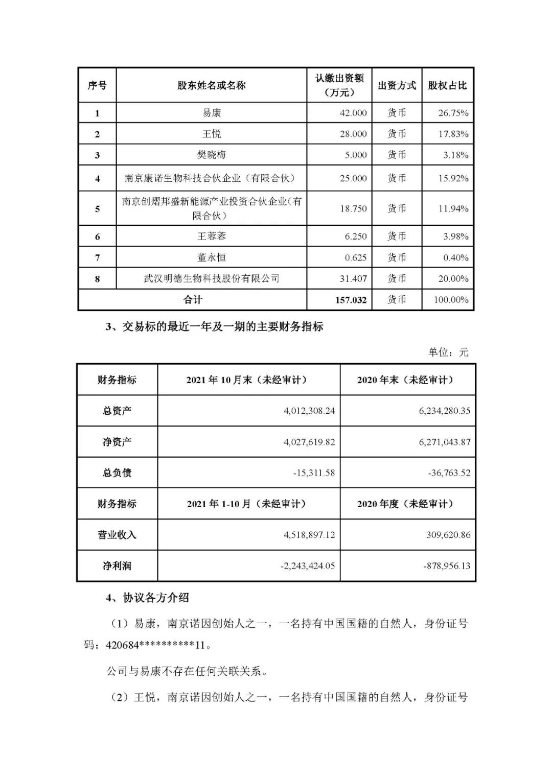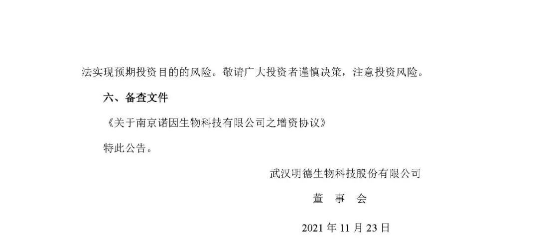 据公告,明德生物与南京诺因生物科技有限公司已于2021年11月22日在江苏省南京市签署了《关于南京诺因生物科技有限公司之增资协议》。
