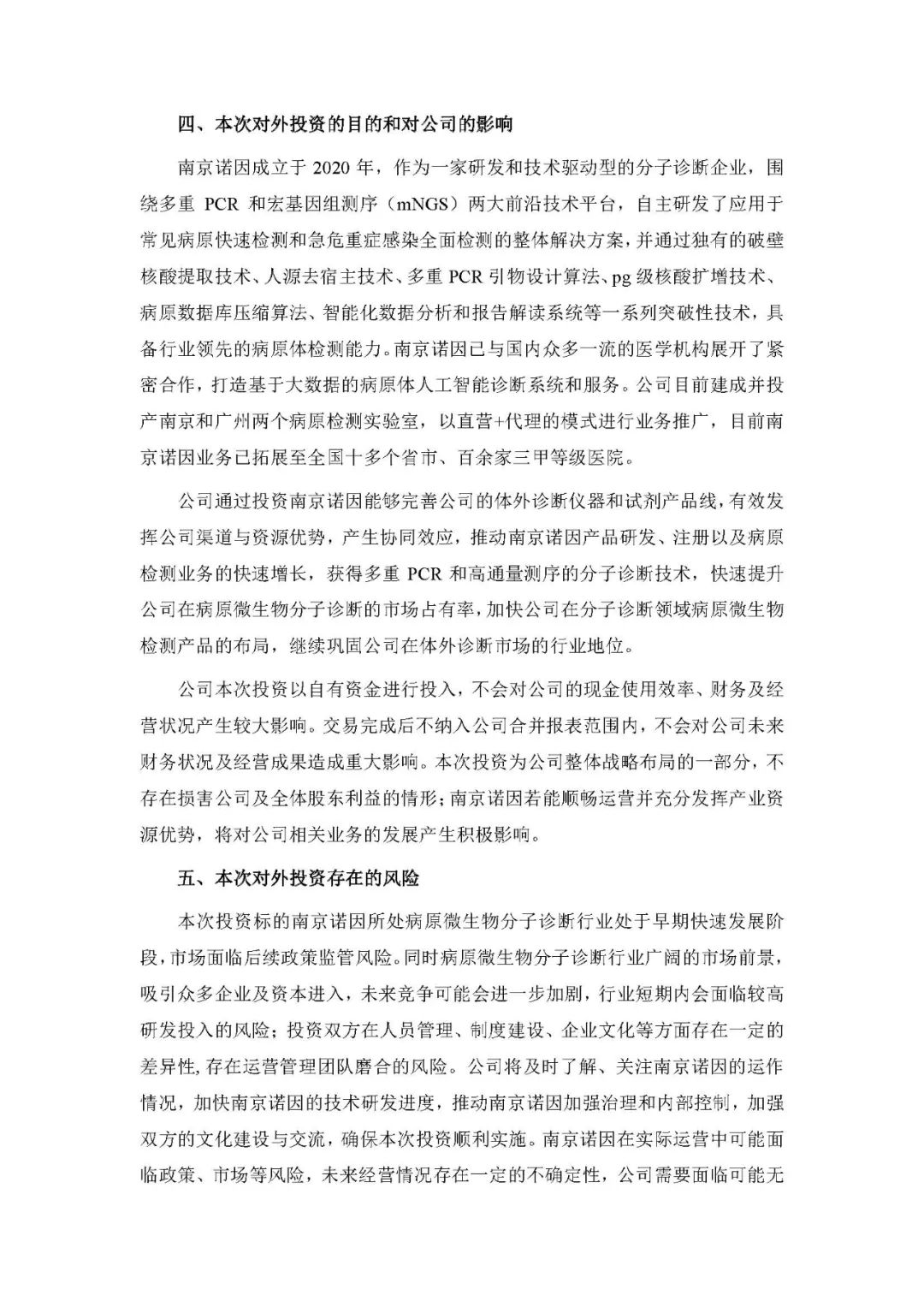 明德生物表示,公司通过投资南京诺因能够完善公司的体外诊断仪器和试剂产品线,有效发挥公司渠道与资源优势,产生协同效应,推动南京诺因产品研发、注册以及病原检测业务的快速增长,获得多重PCR和高通量测序的分子诊断技术,快速提升公司在病原微生物分子诊断的市场占有率,加快公司在分子诊断领域病原微生物检测产品的布局,继续巩固公司在体外诊断市场的行业地位。