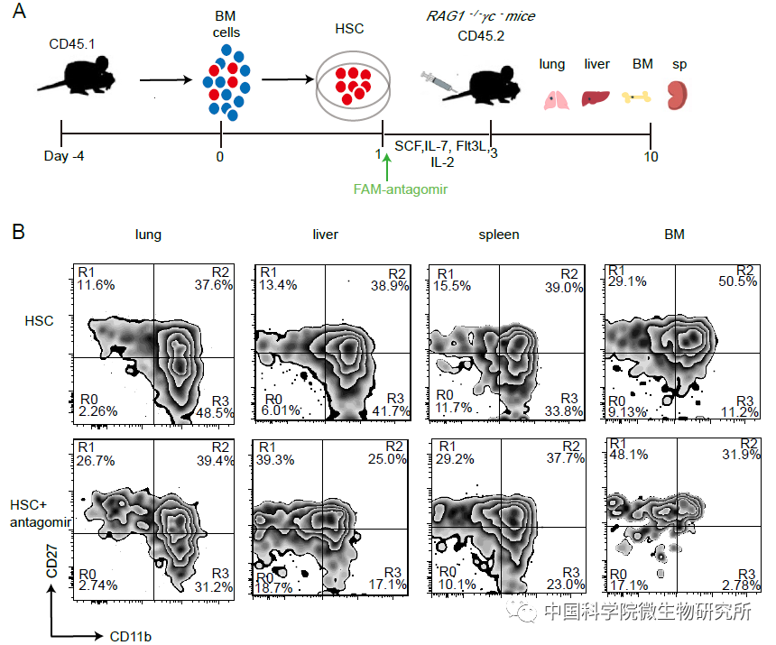 通过体外及体内的NK细胞发育分化实验表明敲低miR-l8la-5p的表达均抑制了NK细胞的发育分化,导致成熟的R3 NK细胞比例显著下降。