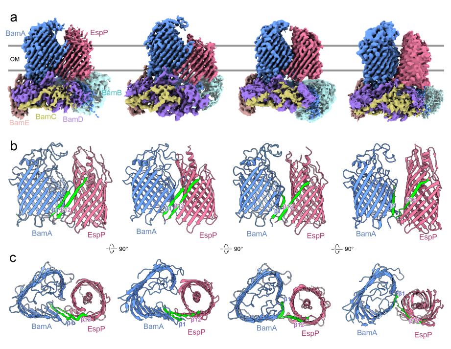 的四个状态的高分辨率三维结构,展示了 BAM对底物 OMP进行组装的完整动态变化过程 ,阐明了BAM识别、整合及释放 EspP的工作机制