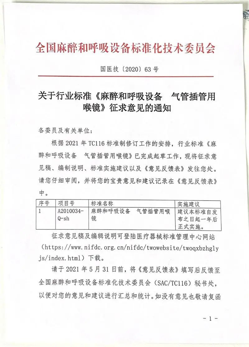 转发关于行业标准《麻醉和呼吸设备 气管插管用喉镜》征求意见的通知
