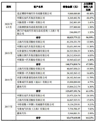 从财务数据中也可以看出,报告期内,公司前五名销售客户中博格华纳、长安汽车、西门子电动车、上海汽车、第一汽车、蔚来汽车等均在册,且占比较大,具体销售情况如下:
