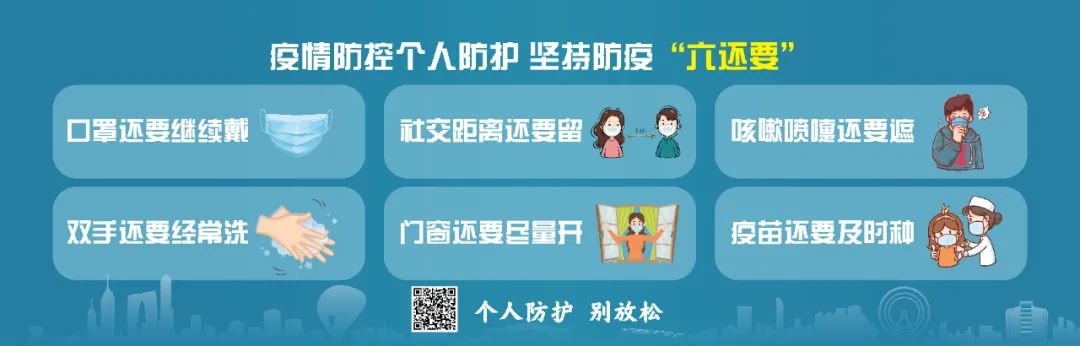 请广大市民继续增强防范意识,不要前往中高风险地区,做好个人防护,坚持佩戴口罩、保持社交距离、注意个人卫生。如出现发热、咳嗽等症状,在做好个人防护前提下,及时就近前往医疗机构就诊。