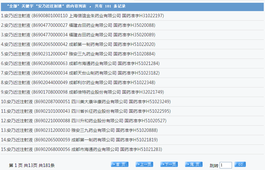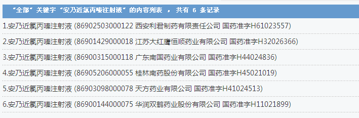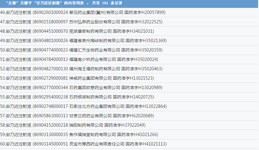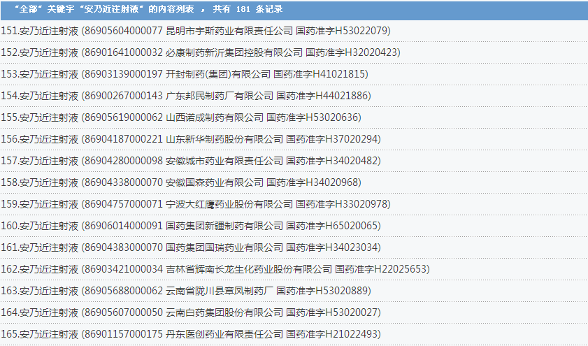 安乃近注射液:国内共有181个批准文号,涉及了上海信谊金朱药业有限公司、福建古田药业有限公司、成都第一制药有限公司等企业: