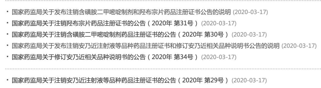 2020年03月17日国家药品监督管理局(NMPA)连续发布了6个关于安乃近注射液、含磺胺二甲嘧啶制剂、羟布宗片等品种注销公告。