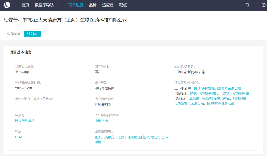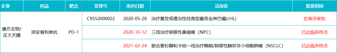 根据 Insight 数据库,派安普利单抗用于治疗至少经过二线系统化疗复发或难治性经典型霍奇金淋巴瘤 (r/r cHL) 的新药上市申请已于 2020 年 5 月 28 日获 CDE 承办。正在开发的适应症中有 2 项已经达到临床终点拟报上市,分别为鼻咽癌(三线)和非小细胞肺癌(一线),详见表格。