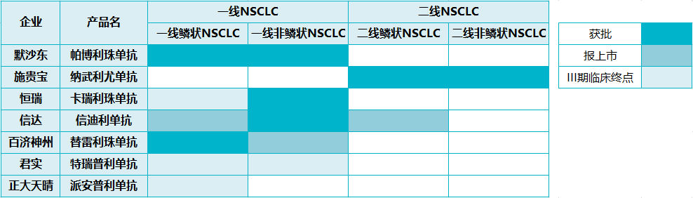 ,已获批联合化疗一线治疗非鳞状 NSCLC,一线鳞状 NSCLC 和二线鳞状 NSCLC 适应症也已报上市,百济和恒瑞的 PD-1 也即将覆盖非小细胞肺癌一线治疗,后来者将面临的挑战不小,未来市场角逐还要看企业销售推广能力以及各产品的临床疗效双重因素。