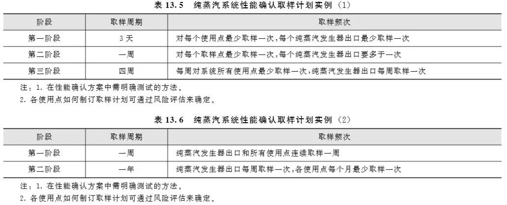 (1) 纯蒸汽系统的性能确认 纯蒸汽系统的性能确认通常需要在纯蒸汽发生器的出口和各个使用点进行取样,非关键的用点可以根据风险评估并有适当的理由时在该用点的下游用点进行取样。通常通过移动冷凝器把纯蒸汽冷却成注射用水来确认纯蒸汽的质量,可接受标准为药典对注射用水的质量要求。纯蒸汽的性能确认最好按照注射用水的 “三阶段法” 进行,但由于纯蒸汽系统的特殊性,也可以采用其他的确认周期,表13.5和表13.6是两个纯蒸汽系统性能确认取样计 划的实例。