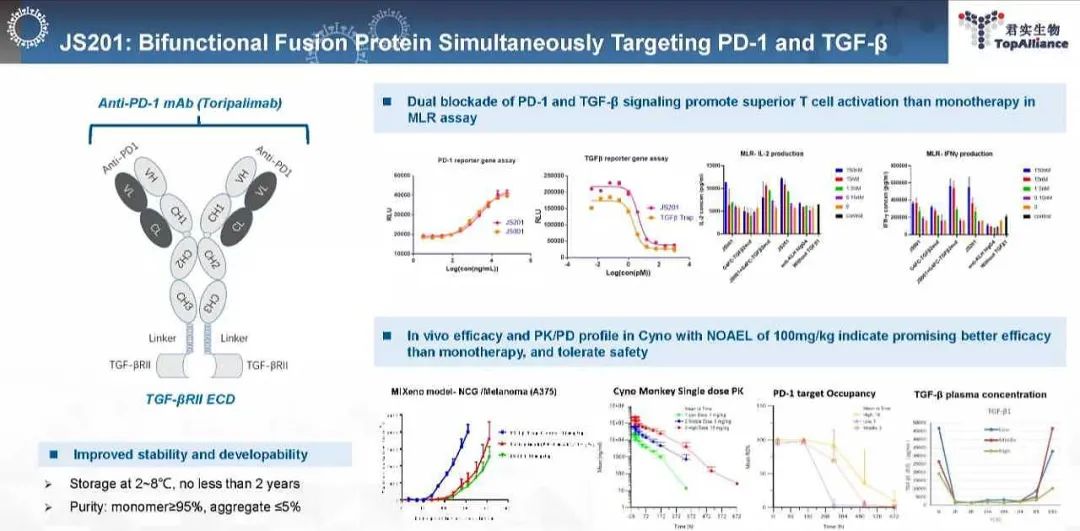根据君实官方披露的信息,JS201 的 PD-1 抗体部分基于特瑞普利单抗,临床前研究显示,同时抑制 PD-1 和 TGFβ 通路较之单药疗法可增强 T 细胞激活,疗效更佳且安全性可控。