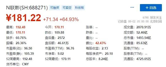 今日高开58.38%,报174.03元/股,市值约1402亿元。