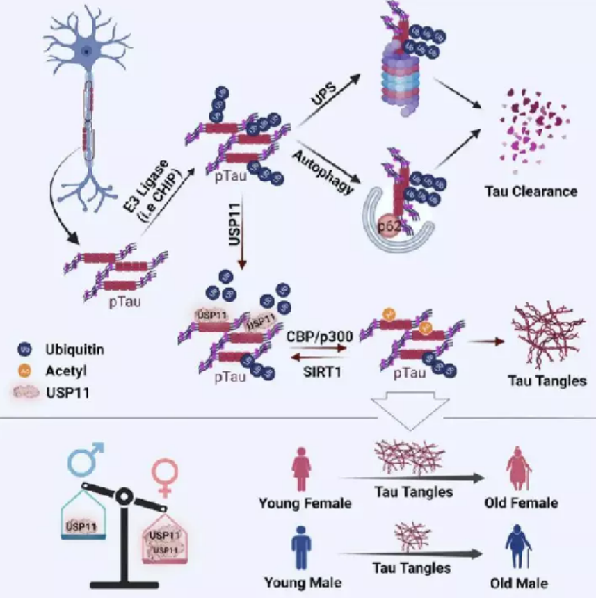 所以在女性中,过多的 USP11 可以导致 tau 的异常去泛素化,阻碍了 tau 的降解,导致病理性 tau 在女性大脑中的聚集高于男性,从而解释了为何女性患阿尔兹海默症的概率高于男性。