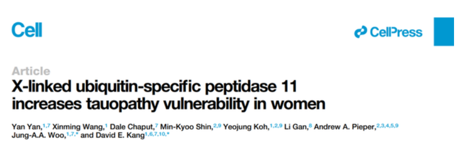 1.Yan, Y., Wang, X., Chaput, D., Shin, M. K., Koh, Y., Gan, L., ... & Kang, D. E. (2022). X-linked ubiquitin-specific peptidase 11 increases tauopathy vulnerability in women. Cell, 185(21), 3913-3930.