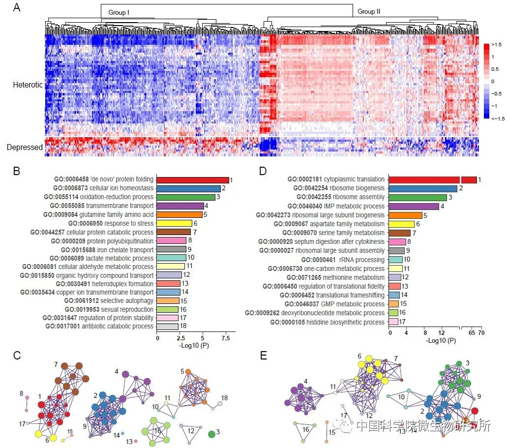 图2. 酿酒酵母野生菌株杂合子在40°C下生长时非叠加基因的表达水平(A),GO富集分析(B, D)和富集通路网络(C,E)