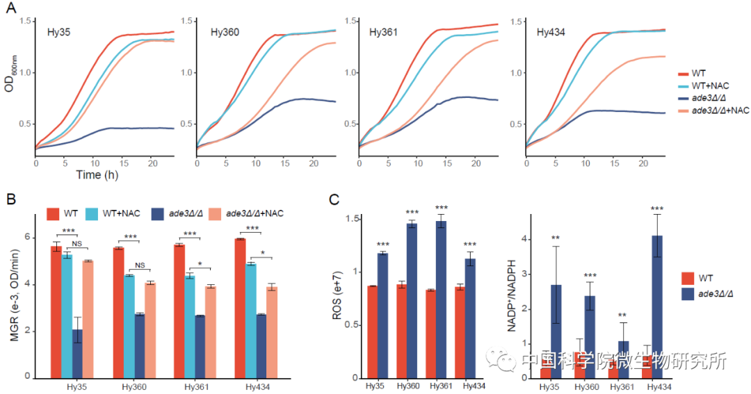图3. ADE3基因敲除对杂合子在40°C下的生长能力(A, B)和胞内氧化压力(C)的影响