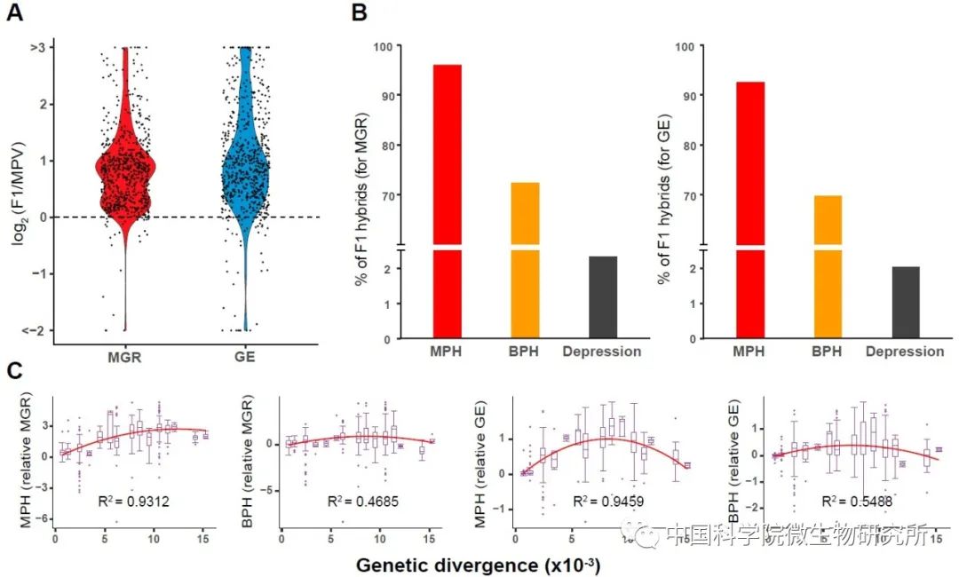 图1. 野生酿酒酵母F1代杂合子40°C下生长的杂交优势(A, B)和杂交优势与双亲遗传距离的关系(C)