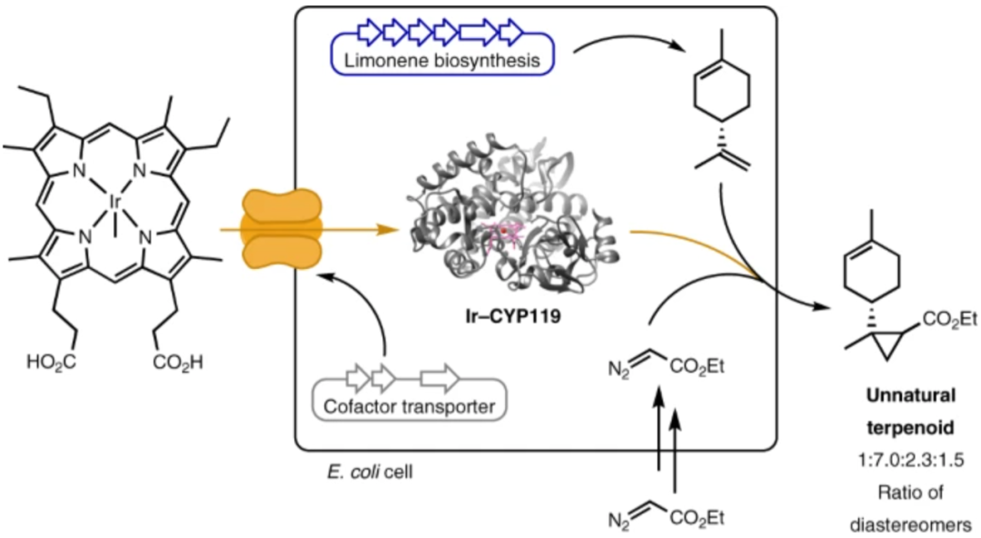 研究人员找到了一种将含有铱的血红素分子转运到大肠杆菌中的方法,在大肠杆菌中,添加到细菌生长培养基中的大部分铱被整合到 P450 酶中,然后合成生物学家平衡了细菌的新陈代谢,以便他们可以在活细菌培养物中生产最终产品 —— 环丙烷化柠檬烯。